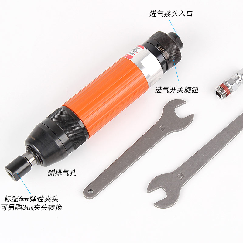 • 產品參數: 夾頭能力:M3,6 (標配M6) 馬達功率:0.45HP 空載轉速:18000rpm 工具能力:砂輪磨頭M32,旋轉銼刀M22 耗 氣 量:0.45m3/min 全 長:214mm 重 量 : 0.88kg 【旋鈕開關/超高同心度】