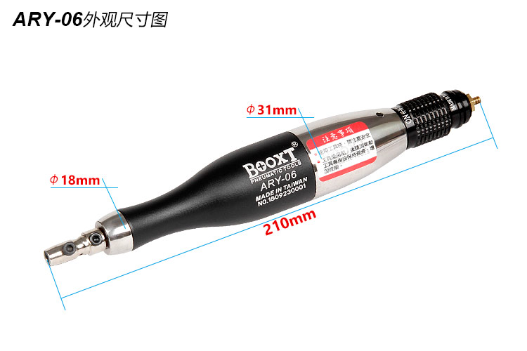 • 產品參數: 夾頭直徑:1mm/3mm 前后行程:0.6mm 行程轉數:25000bpm 外形尺寸:31*210mm 耗 氣 量:0.21m3/min 重 量:0.28kg 【工業型/葉片式】