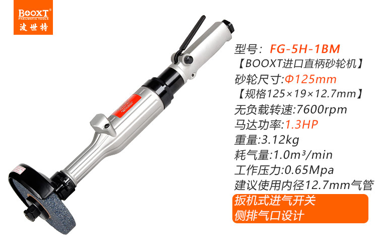 • 產(chǎn)品參數(shù): 砂輪尺寸:125*19*12.7mm(5寸) 馬達(dá)功率:1.3HP 空載轉(zhuǎn)速:7600rpm 耗 氣 量:1.0m3/min 全 長:505mm 重 量:3.12kg 【工業(yè)型/扳機(jī)開關(guān)】