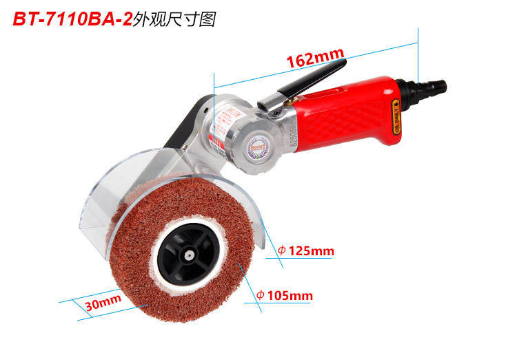 • 產(chǎn)品參數(shù): 拉絲輪尺寸:30*105mm 空載轉(zhuǎn)速:7000rpm; 工具長度:162mm; 工具重量:1.05kg; 馬達(dá)功率:0.5HP; 耗 氣 量:0.65m3/min; 使用工作氣壓:0.65Mpa; 推薦使用內(nèi)徑8mm氣管; 平時(shí)使用應(yīng)多加氣動(dòng)油保養(yǎng). 【經(jīng)濟(jì)型】