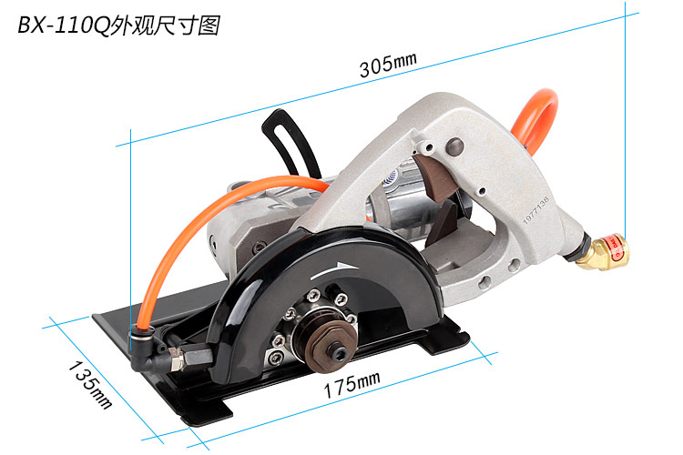 • 產(chǎn)品參數(shù): 產(chǎn) 品 型 號:BX-110Q(側(cè)排氣) 切割片尺寸:114mm 切割片孔徑:20mm/22mm 最大切割深度:30mm 空 載 轉(zhuǎn) 速:6500rpm 馬 達 功 率:470W(0.63HP) 機 身 長 度:330mm 重 量:2.92kg 耗 氣 量:0.5立方米/分鐘 噪 音 值:85db 進 氣 口:1/4" 推薦使用氣管:內(nèi)徑8mm 使用工作氣壓:0.63Mpa